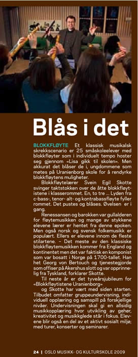 BLOKKFLØYTE! Et klassisk musikalsk skrekkscenario er 25 småskoleelever med blokkfløyter som i individuelt tempo hoster seg gjennom «Lisa gikk til skolen». Men akkurat det blåser de i, ungdommene som møtes på Uranienborg skole for å rendyrke blokkfløytens muligheter. Blokkfløytelærer Svein Egil Skotte svinger taktstokken over de åtte blokkfløytistene i klasserommet. En, to tre ... Lyden fra